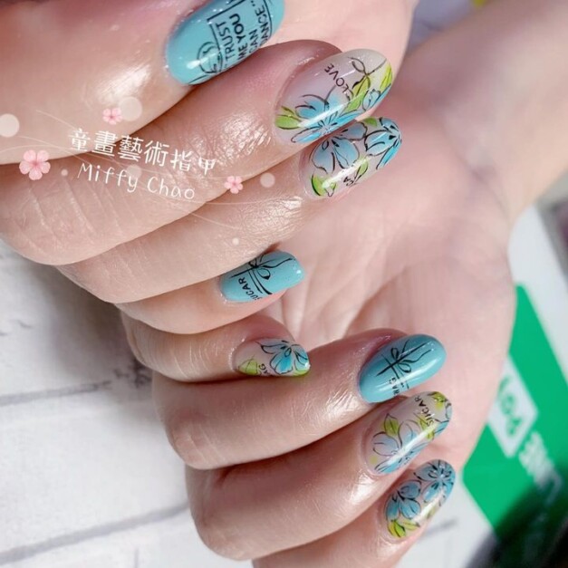 藍綠色調的手繪花款,個性十足但優雅又耐看♡ 10指手繪好犯規啊