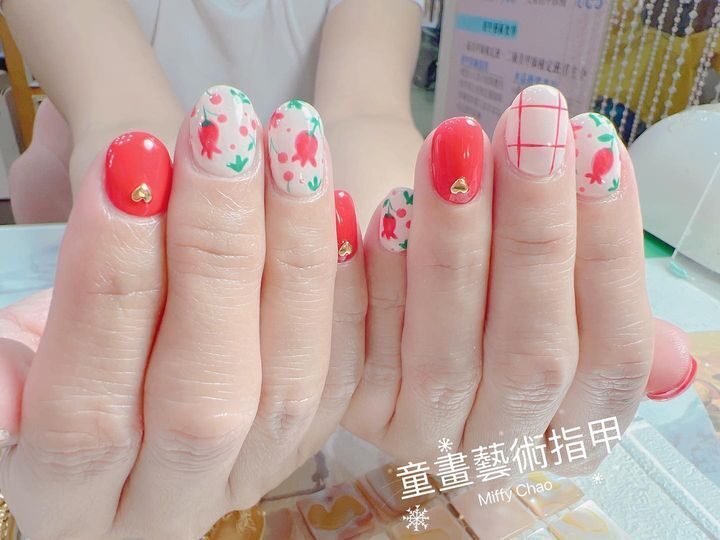 春天款小花手繪,紅配綠大膽顏色搭配,可愛俏皮風